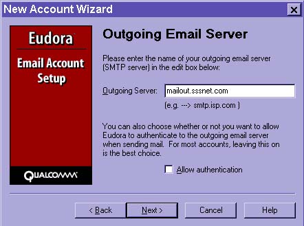 8. Enter in the outgoing mail server information as shown below. Be sure